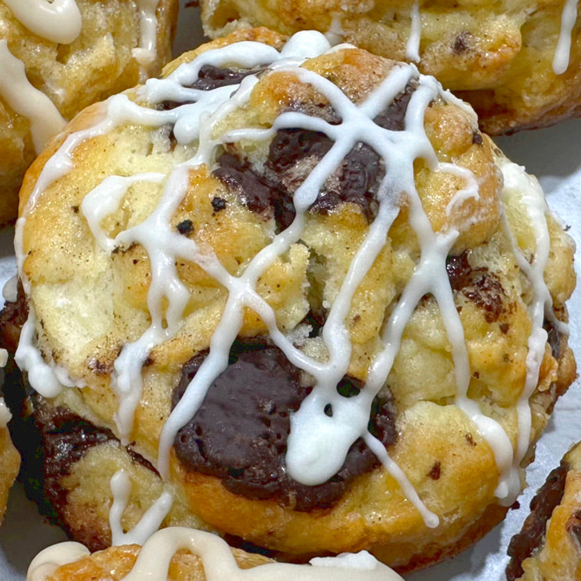 Our homemade Chocolate Chunk Scones are irresistibly buttery and flaky, packed with three types of rich, melty chocolate—dark chocolate, bittersweet chocolate, and milk chocolate. This perfect combination creates a delightful depth of flavor, while a drizzle of sweet vanilla glaze adds the finishing touch.