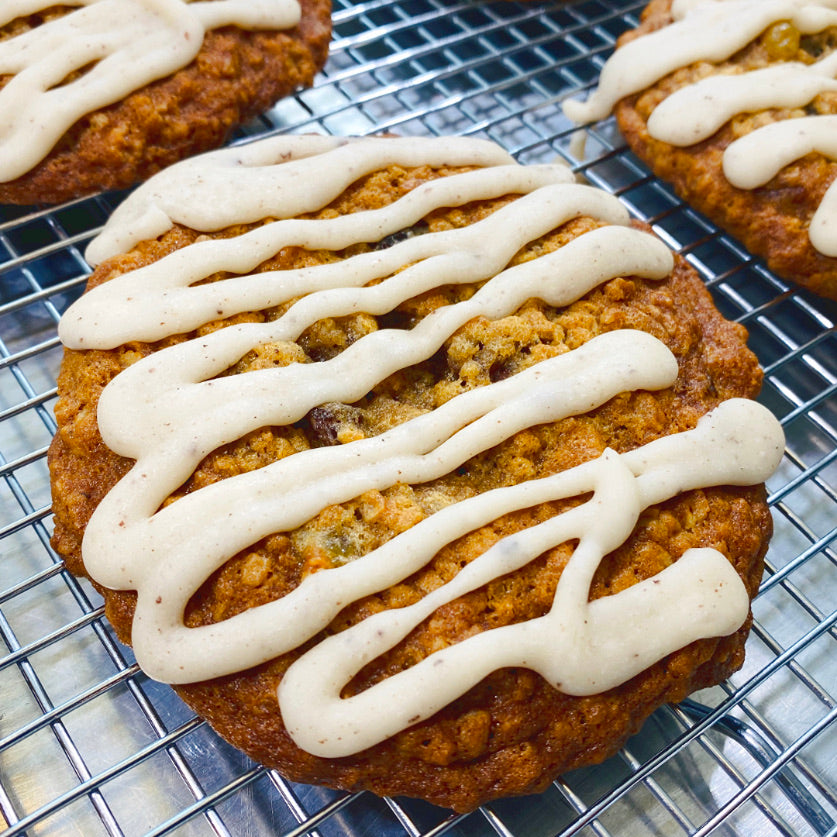 Made fresh with wholesome old fashioned oats, sweet raisins, pecans, and topped with a wonderful brown butter vanilla glaze.