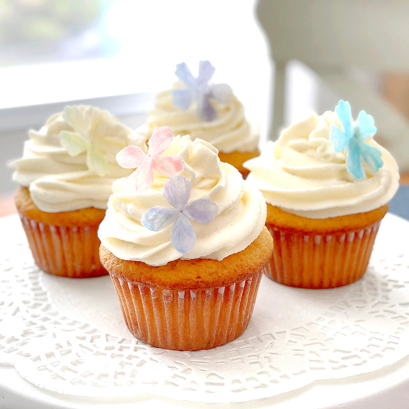 Delicate vanilla cupcake with a decadent vanilla butter cream frosting topped with pastel edible flowers.